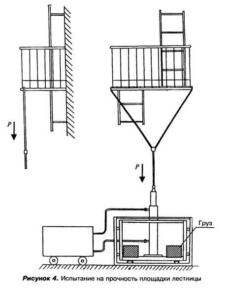 4.14. Прочность ограждений марша и площадки маршевых лестниц проверяется путем прикладывания горизонтальной нагрузки 0,54 кН (54 кгс) к каждому ограждению (приложение 1, рис. 5 ).